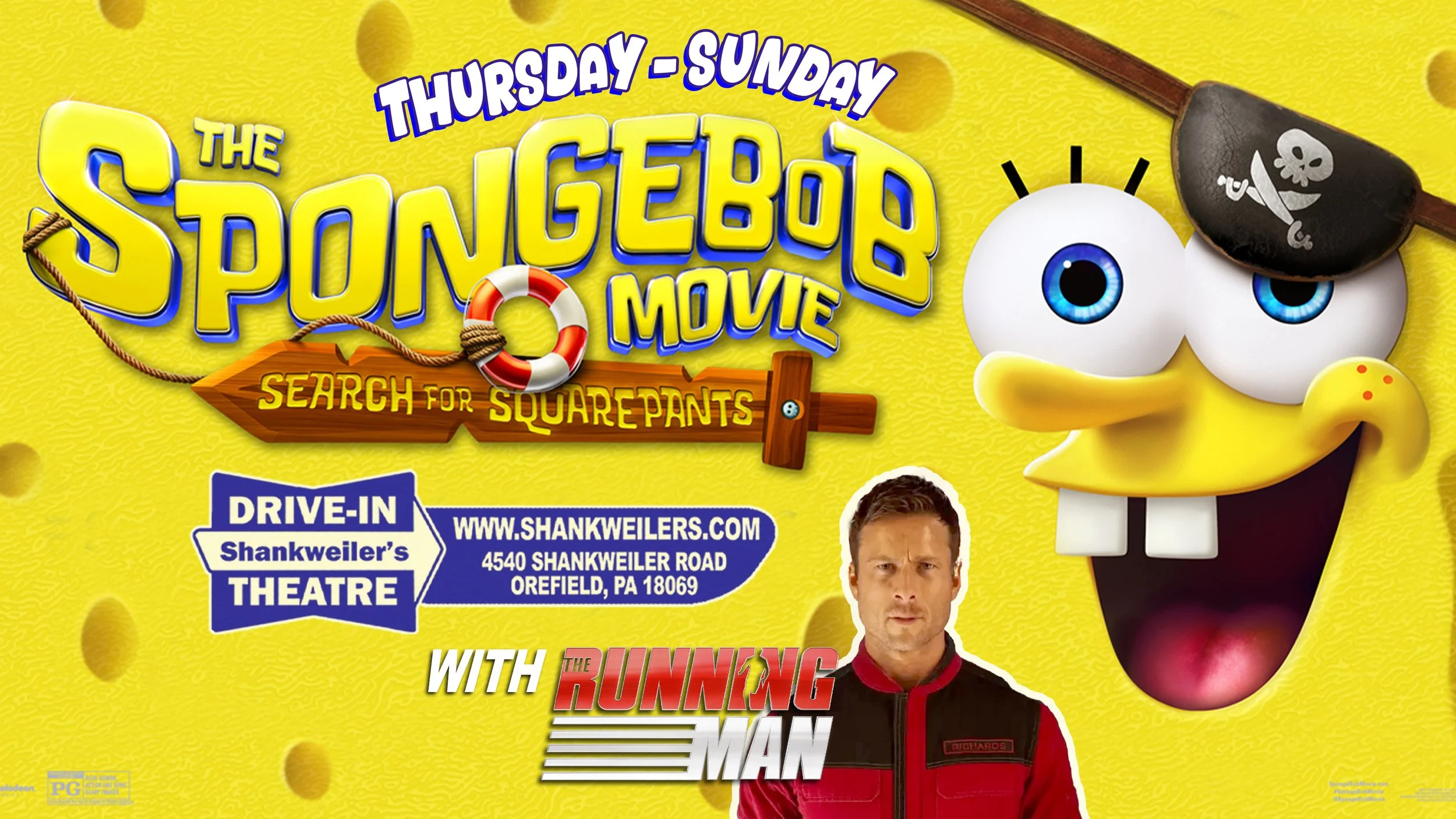 Join us for the drive-in premiere of THE SPONGEBOB MOVIE: SEARCH FOR SQUAREPANTS! The iconic animated marine invertebrate returns to the BIG screen in a stylized adventure full of laughs and raucous fun. After intermission, the fun continues in a new direction with the new action-packed action-comedy, Edgar Wright’s THE RUNNING MAN!