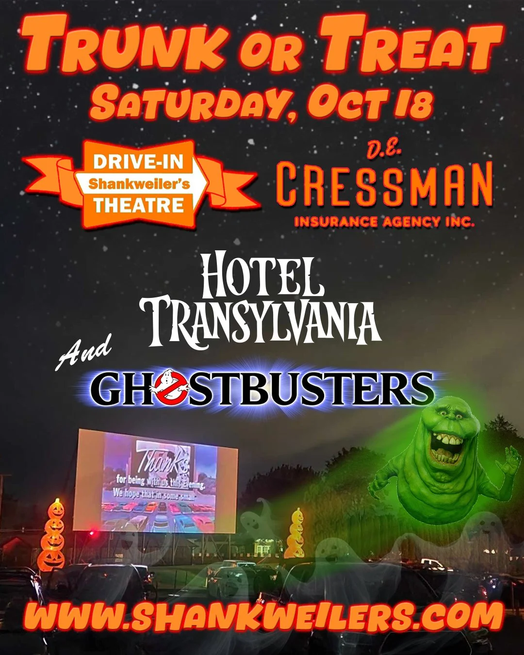 Saturday, October 18: We are excited to announce the movies for our third annual Trunk or Treat at Shankweiler's Drive-In! We will be presenting a double feature of HOTEL TRANSYLVANIA and GHOSTBUSTERS!