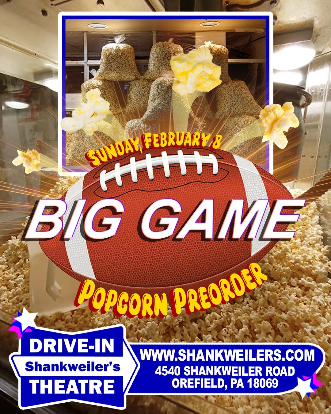 The Big Game is this Sunday, and we're taking the night off... but we're not leaving you empty-handed! To help facilitate celebratory sports-party snackage, you can preorder giant bags of the best popcorn in the Lehigh Valley and pick them up right here at the theater ahead of the game!