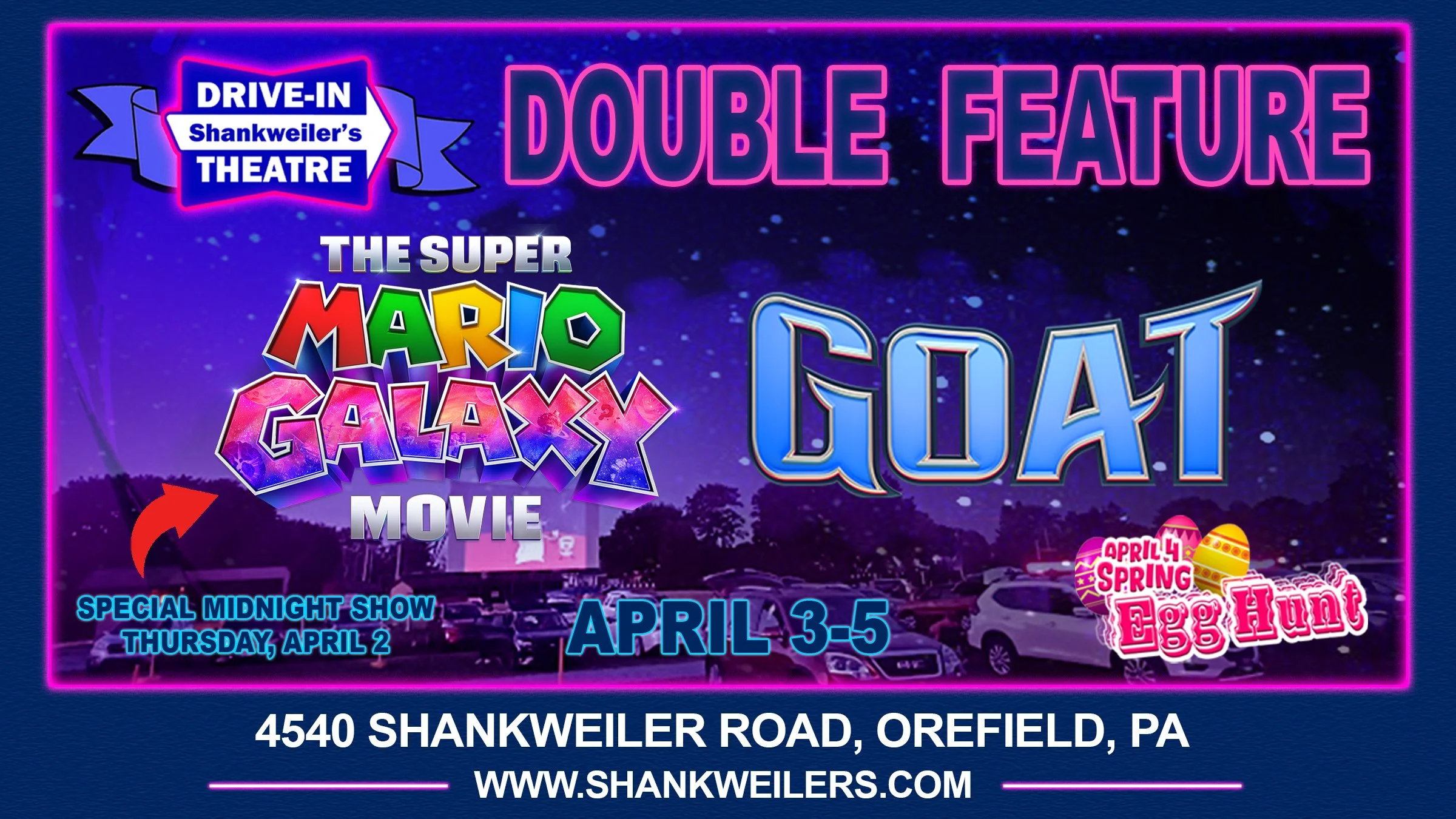 We'll scatter thousands of eggs under our iconic drive-in screen for an all-ages hunt starting at approximately 7:15pm ahead of the movies. This year, we will have special Nintendo twist with some of our eggs being themed around the drive-in premiere of The Super Mario Galaxy Movie!