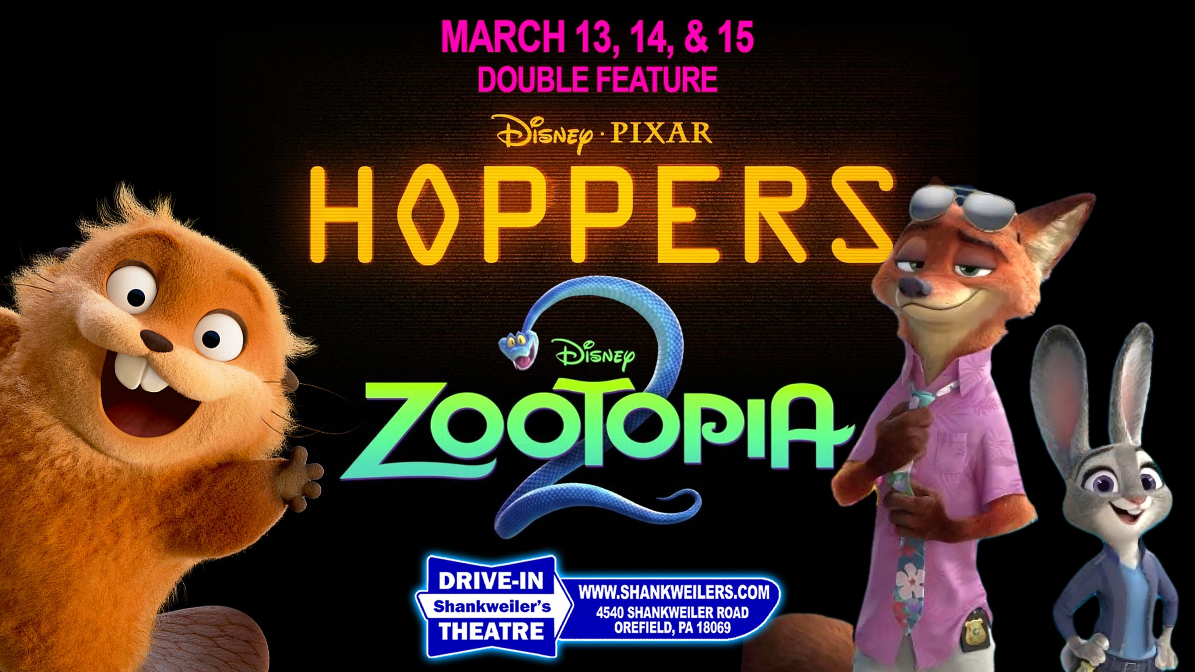 This weekend, HOPPERS comes to Shankweiler's Drive-In! We're bringing in the new Disney/Pixar original film that's the number one movie in America for some springtime family fun! After intermission, we debut another recent Disney release, ZOOTOPIA 2!