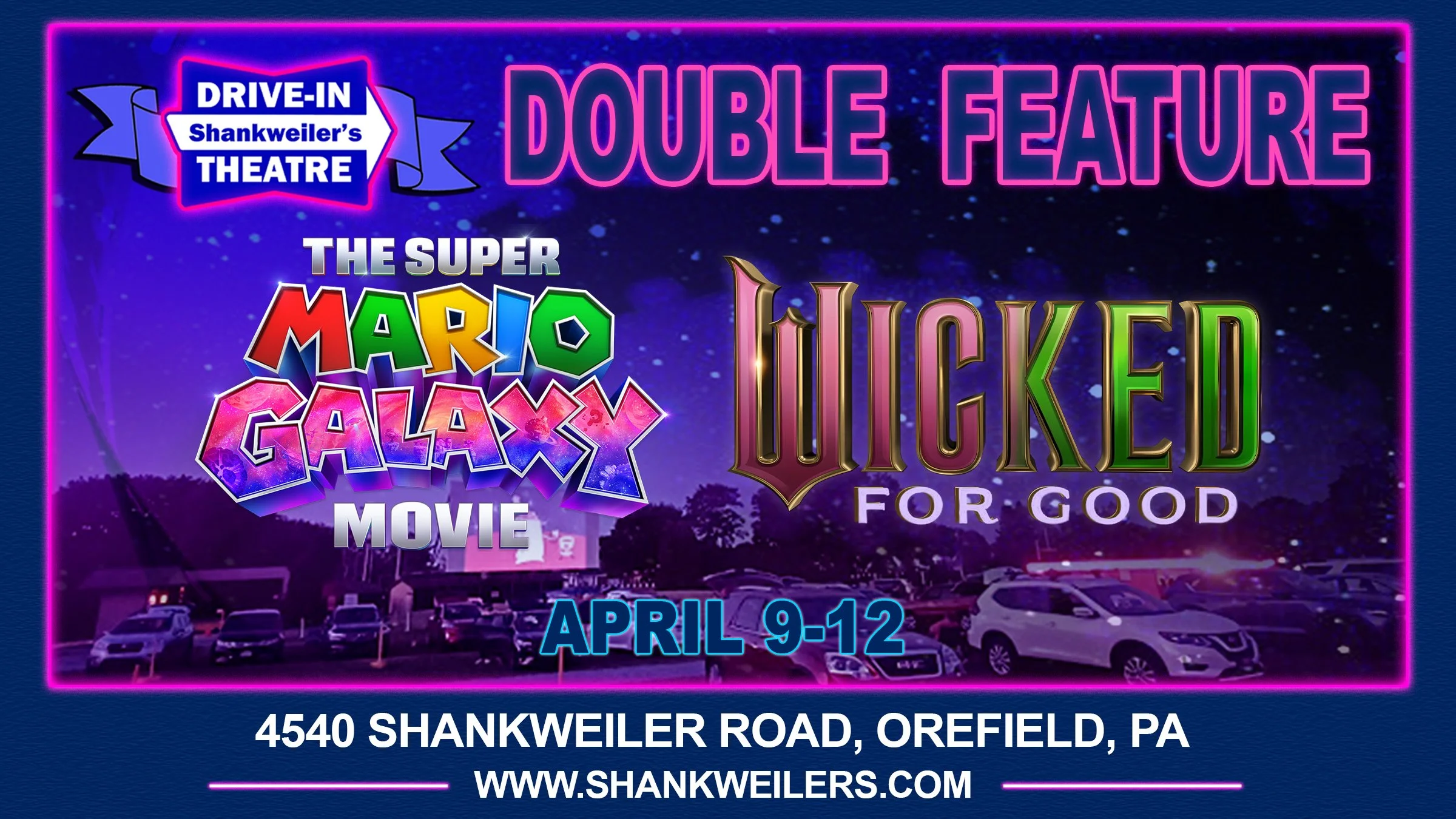 This week, THE SUPER MARIO GLAXY MOVIE continues to blast off on our giant drive-in screen! For our cofeature, we bring back a fall favorite, WICKED: FOR GOOD, with some springtime showings. We also uncovered a small trove of Wicked buckets and cups that we will be selling at a discounted price while supplies last!